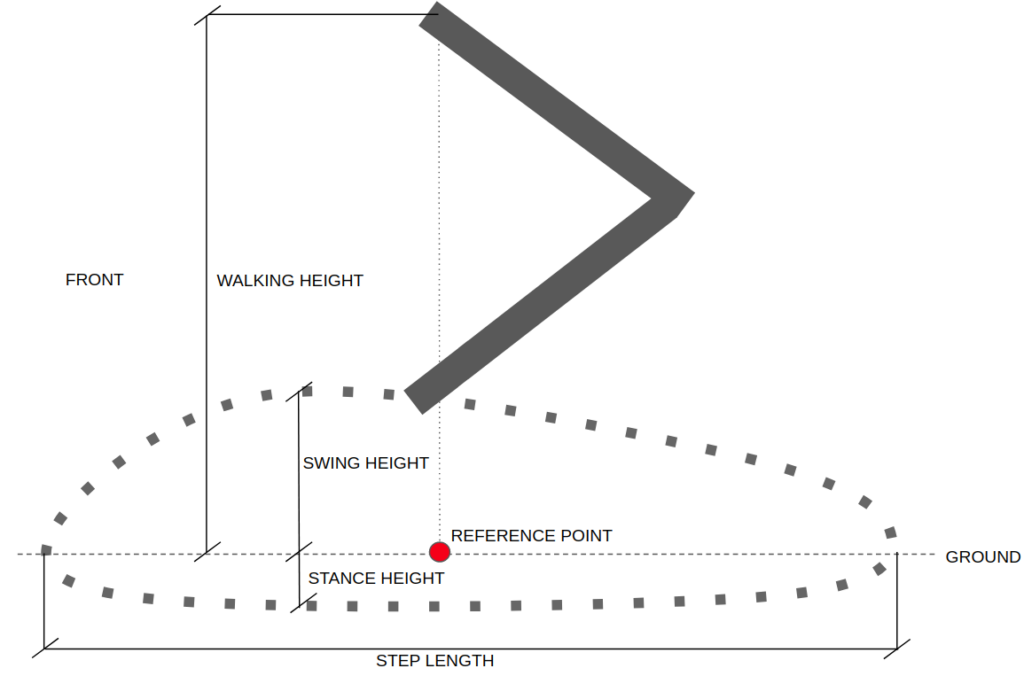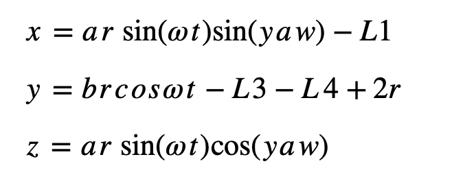これを元に、脚の先端の置きたい絶対座標の軌道を時間変数tで定義さえできれば、足軌道が設定できるという魂胆です。
