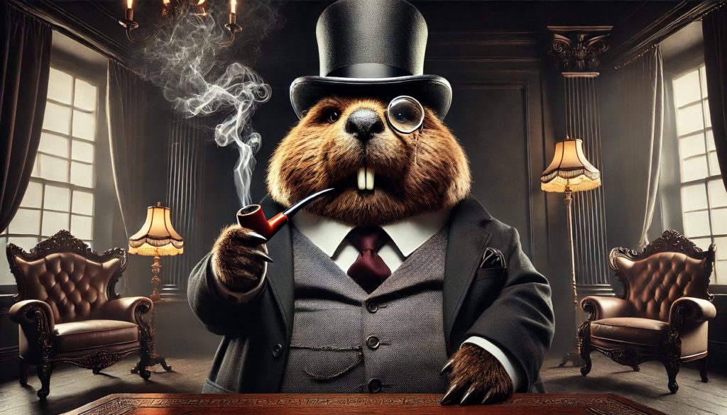 (訳:悪役の太った金持ちビーバーがキセルをふかしている画像を横長で描いて。姿は英国紳士風で全体的に暗い情景)