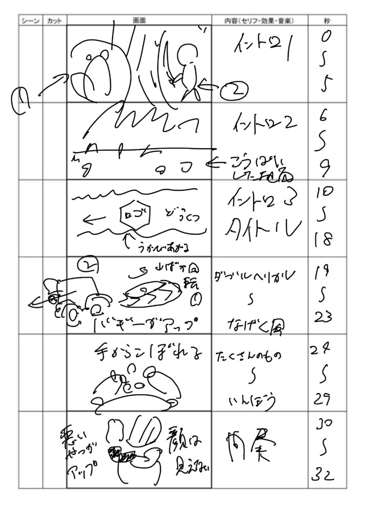 まず、動画内の絵の見せ方を考えるため、アニメ作成によく用いられている絵コンテ(台本)を作ってみました。